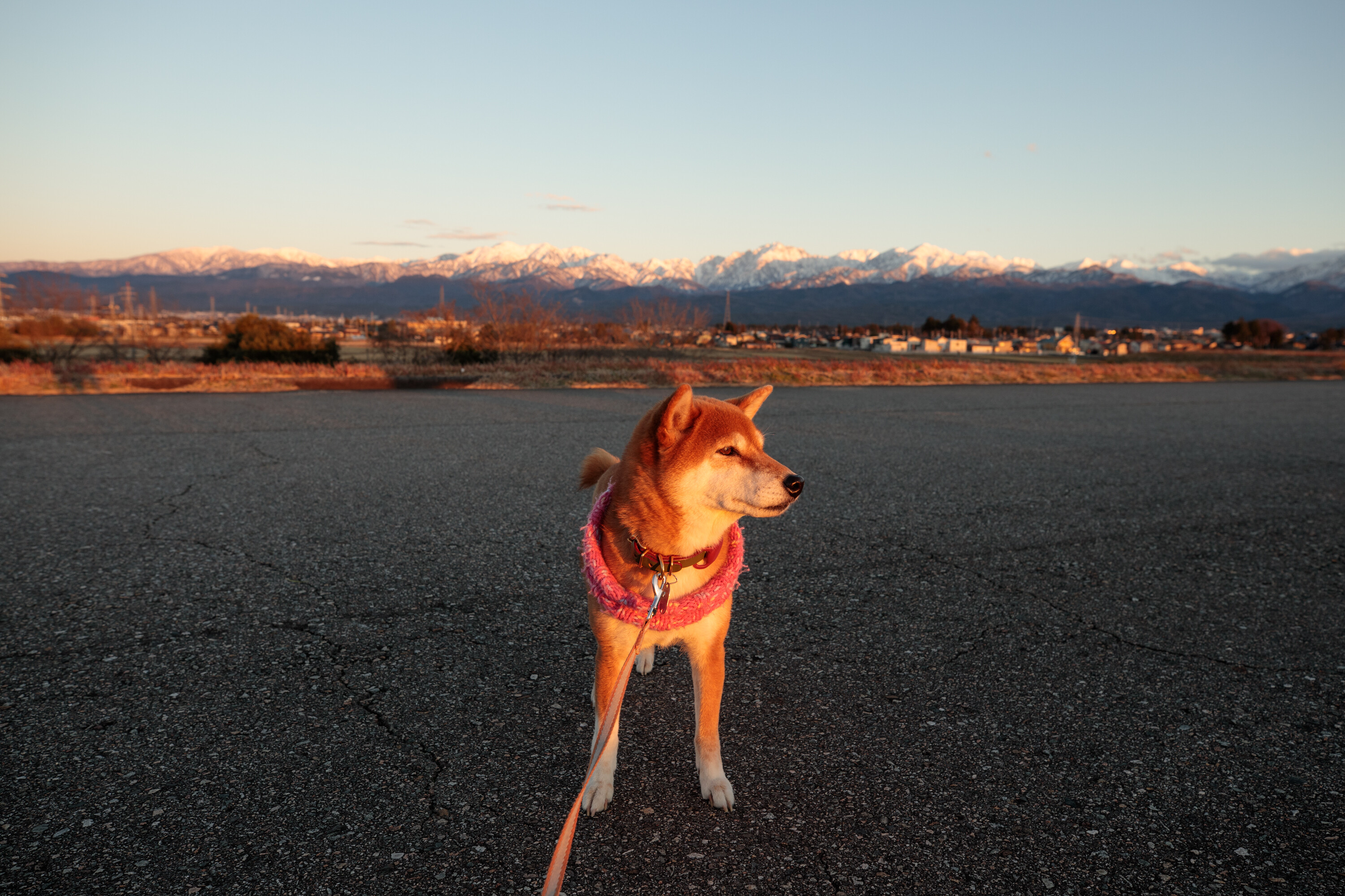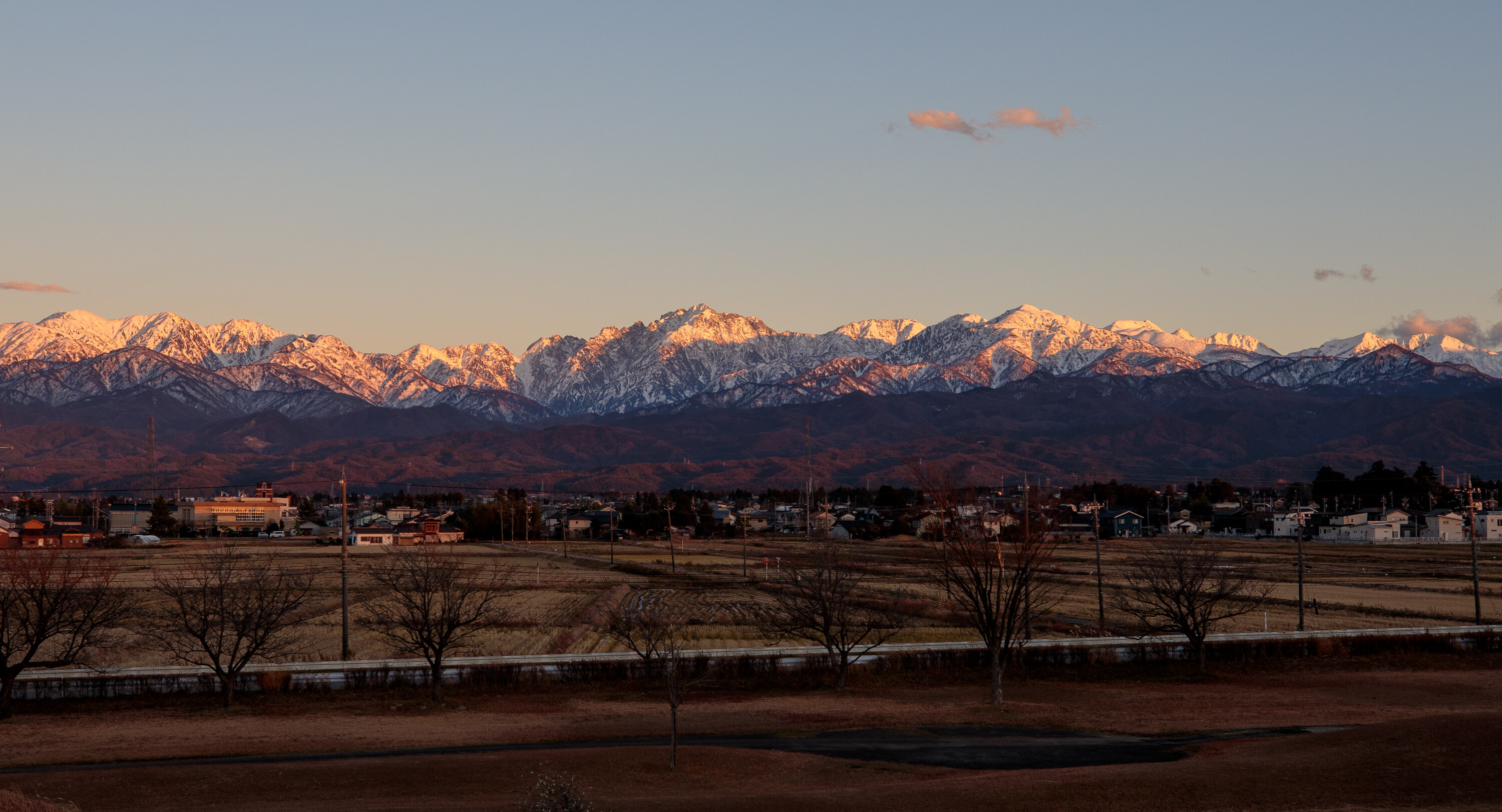 近所の土手から、夕日を浴びる北アルプス。