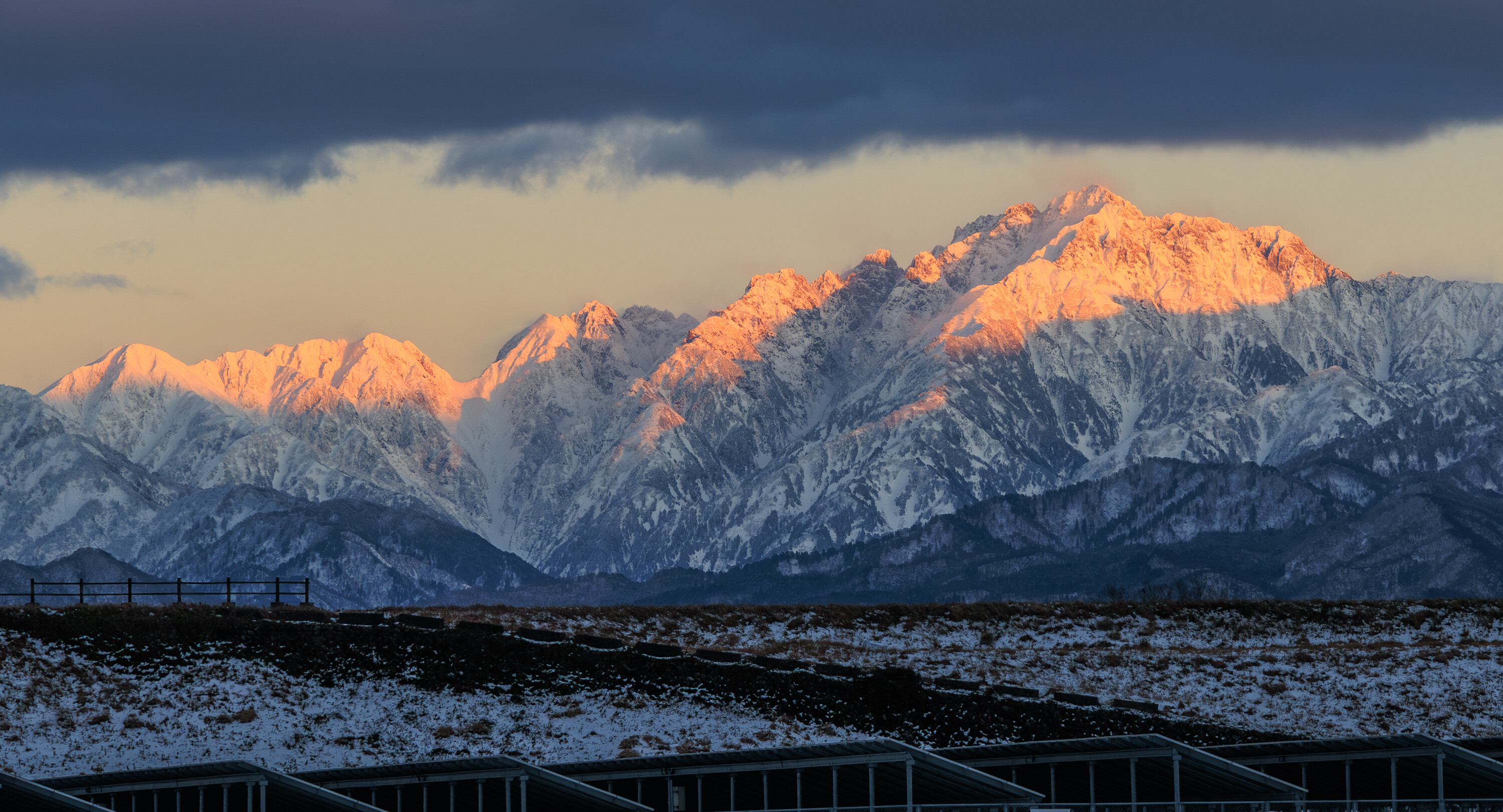 ※上の写真を補足すると、上に見える雲は山よりも手前で、山より低い位置にあります。この時は山の直上以外が雲で覆われ、もちろん太陽も隠れている状態。おそらく2000m程度の低い雲の上を通して、3000m級のアルプスに陽が当たっているのが面白かったです。